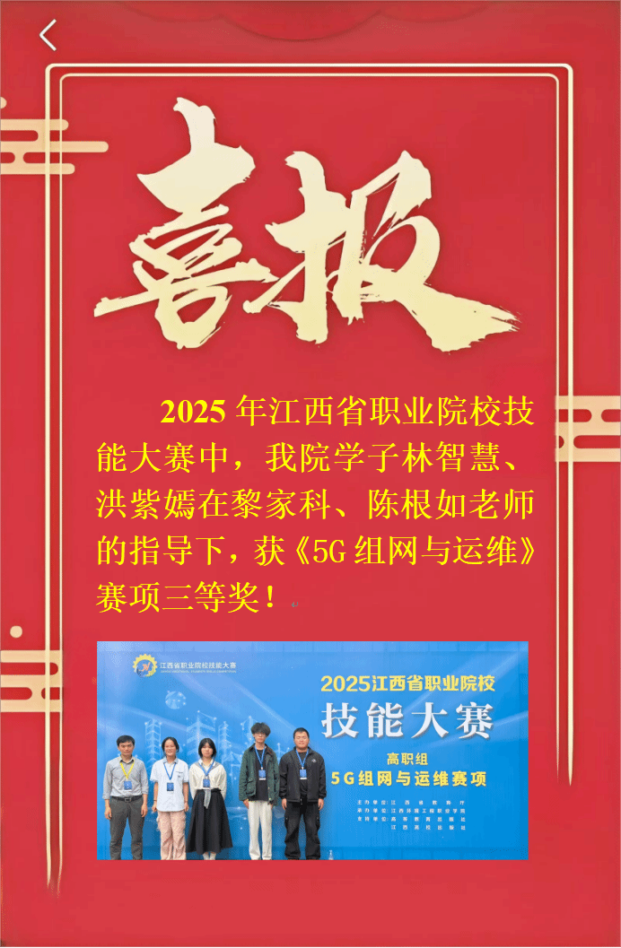 喜报!我院学子获江西省职业院校技能大赛5G组网与运维赛项三等奖